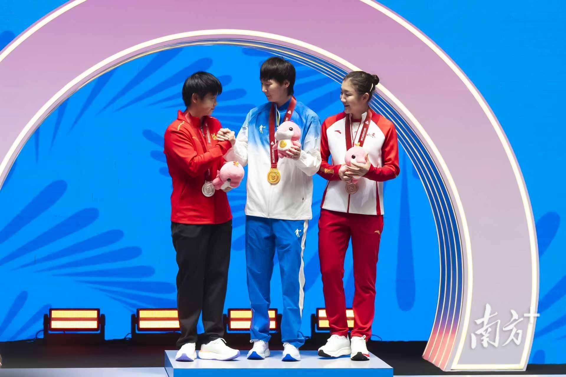 赛后的发布会上,惺惺相惜的“海产姐妹”开启了“商业互吹”,对彼此本届比赛的单打表现都给予了极高的评价。孙颖莎表示,抛开输赢来讲,两人在全运会的赛场上都拼尽了全力。“曼昱一直是我非常尊敬的对手,平常一起训练也是最好的队友,今年交手过很多次,也基本上都是在决赛中相遇,再加上她也是上届的冠军,所以其实我今天也是抱着拼的心态来打。”